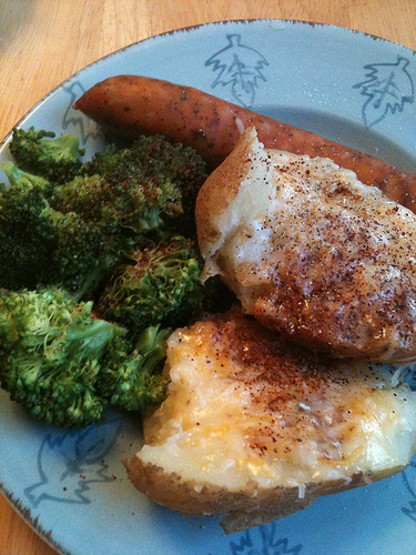 Baked potato topped with shredded cheese, steamed broccoli, and a chicken andouille sausage.