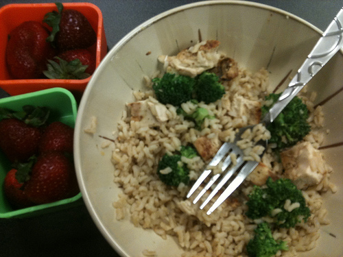 I had some brown rice at work that I heated up with the chicken and broccoli to make a nice and healthy lunch.