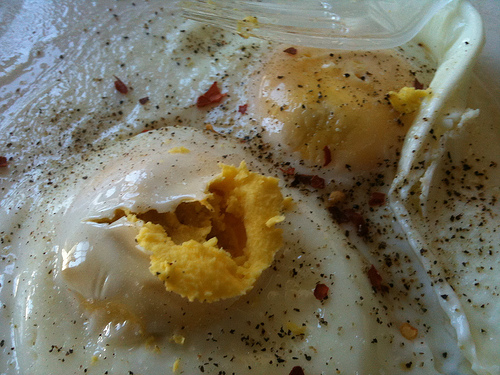 With a loud pop, I saw yellow fragments hurtling towards my face. I got yolk on my glasses, hair, and front of my shirt. It wasn’t too much and I had to laugh at myself. At least the yolk was cooked and not runny, that would have hurt.